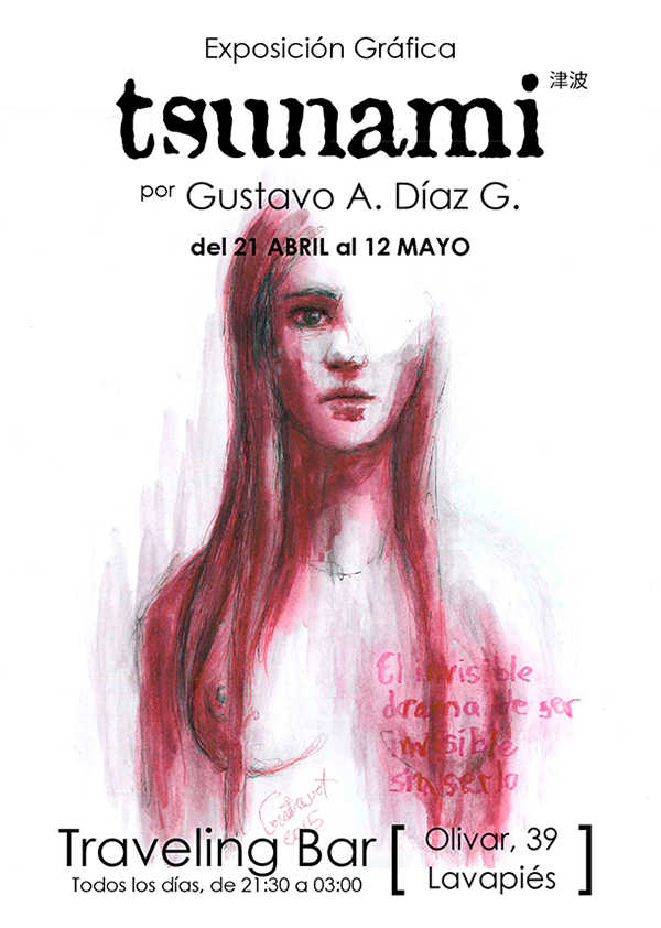 «Ausencia 01» lo utilicé como primer cartel promocional de la exposición «Tsunami», realizada en el Traveling Bar de Lavapiés (Madrid, España) entre el 21 de abril y el 25 de mayo del 2015..