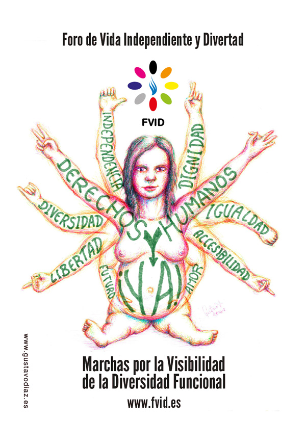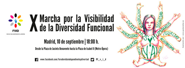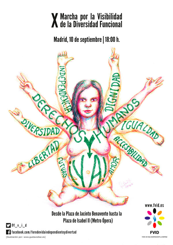 Ilustración y diseño del cartel de la «X Marcha por la Visibilidad de las Personas con Diversidad Funcional» de la «Red de Marchas: Derechos Humanos ¡YA!» del Foro de Vida Independiente y Divertad (FVID) que se celebró en Madrid el 10 de septiembre del 2016.